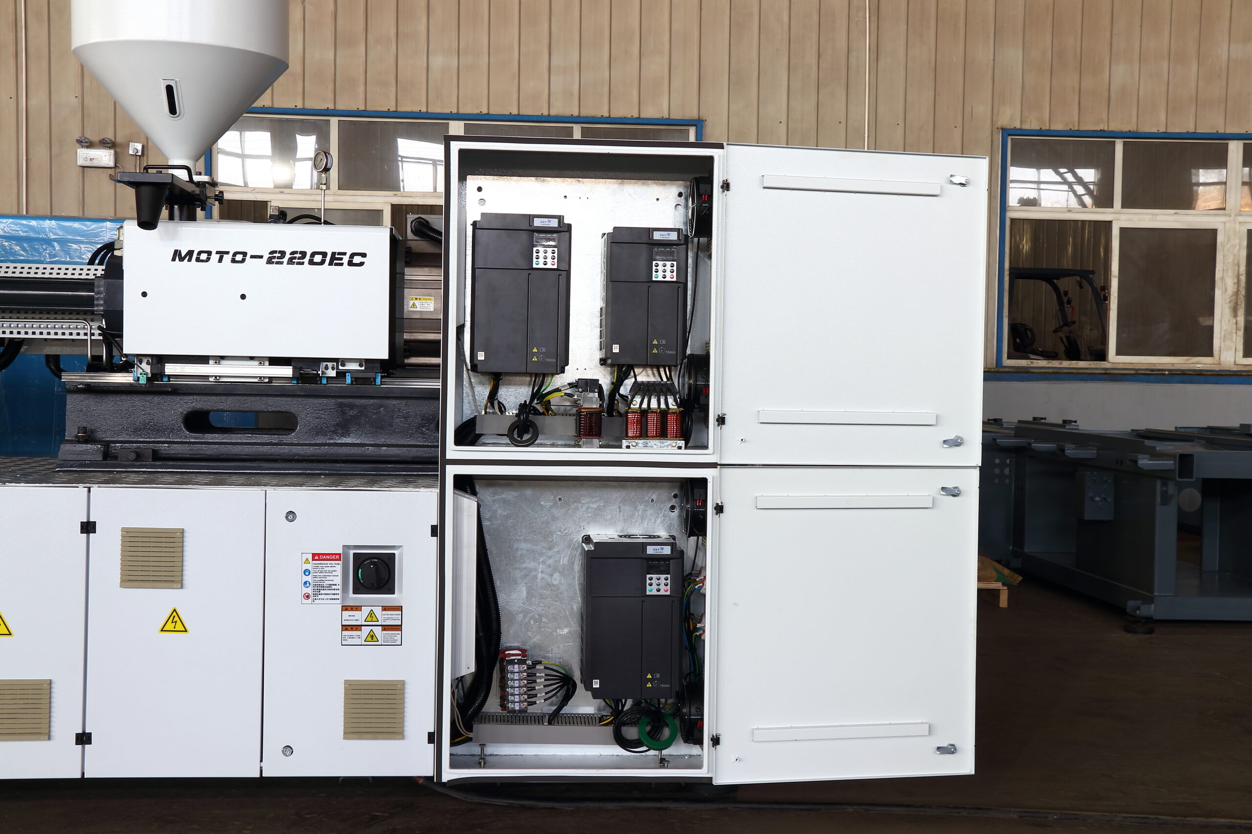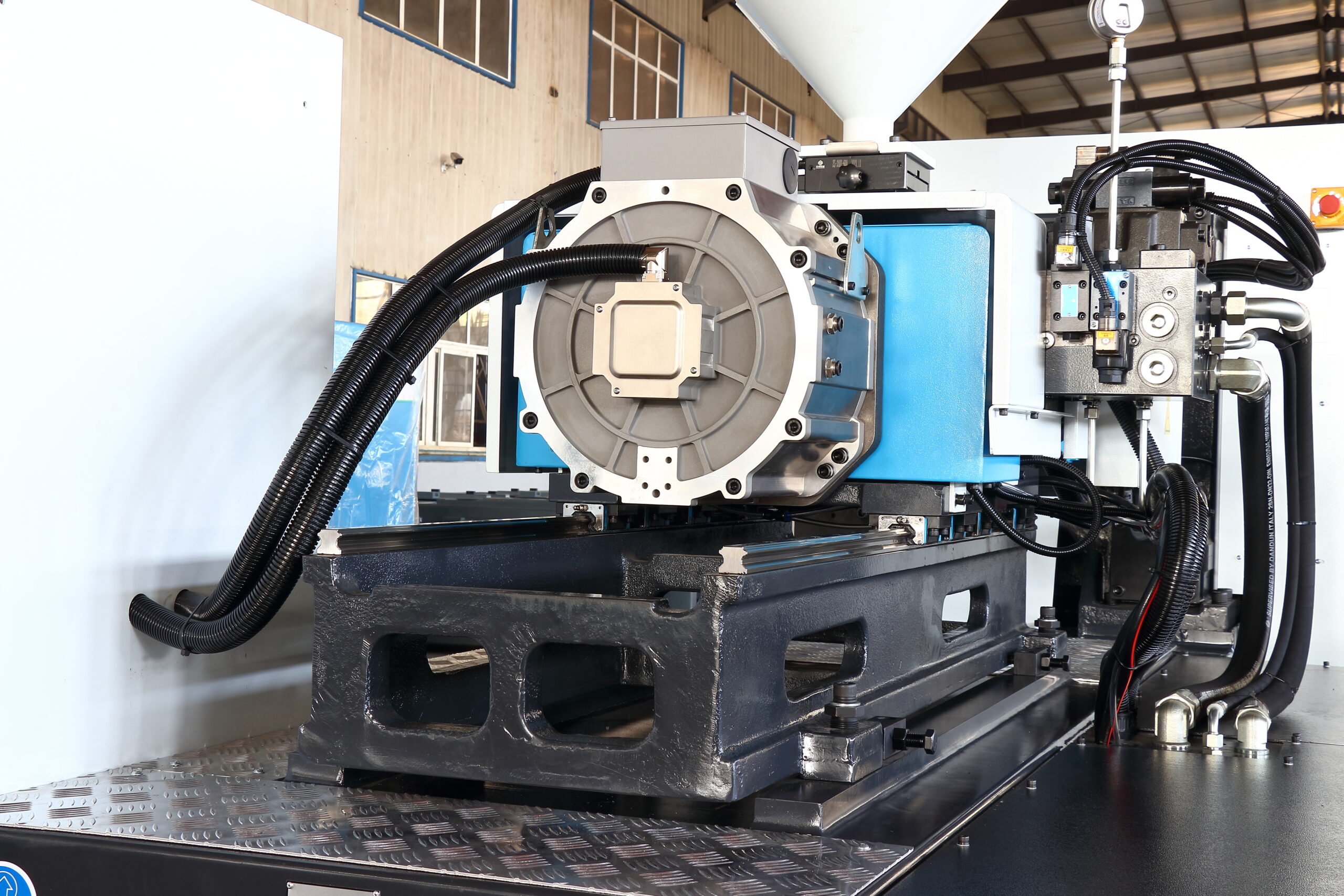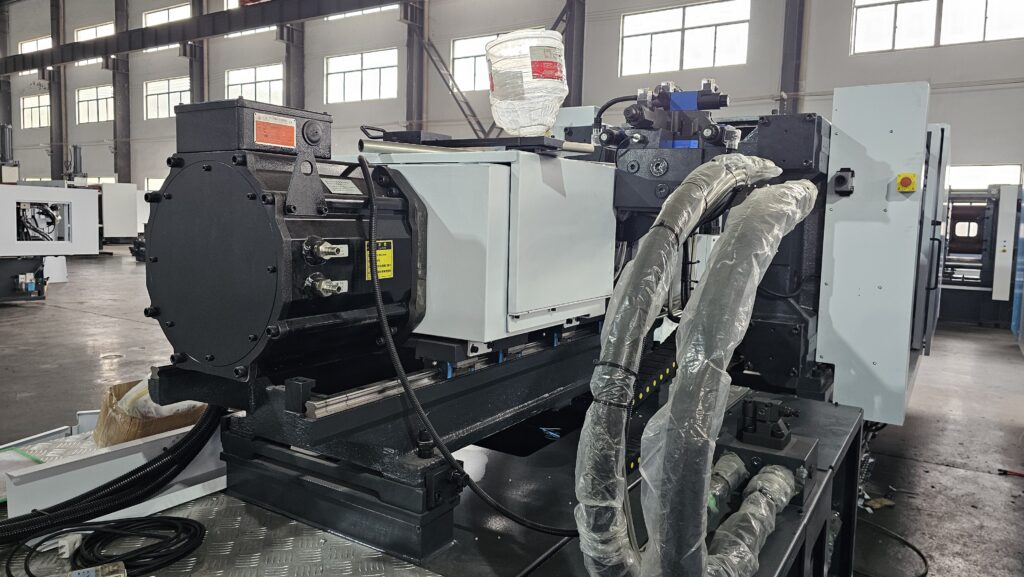 This machine matches the performance of a standard servo injection molding machine, but features an electric servo motor on the injection unit for greater energy efficiency. It offers improved control, reduced noise, and lower maintenance without compromising on power or precision.